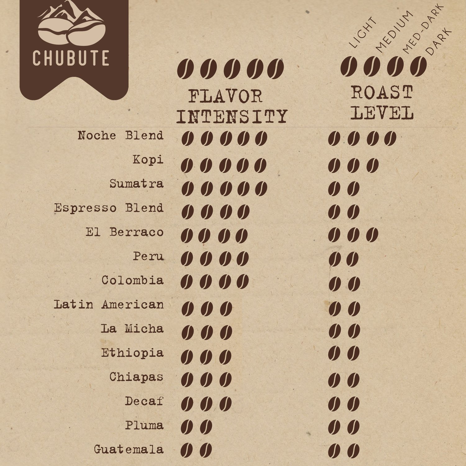 SHOP OUR ROASTSNOT SURE WHAT BEAN TO TRY NEXT? CHECK OUT OUR INTENSITY CHART HERE. Samplers Categories: All Our Roasts Holiday House Blends Single Origin Decaf Samplers Gift Cards Chubute Single Origin Sampler : Whole Bean $38.00 Sold Out